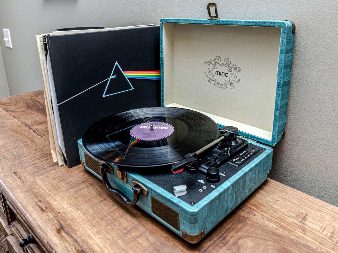 Wallpaper Old gramophone with records on the chest of drawers