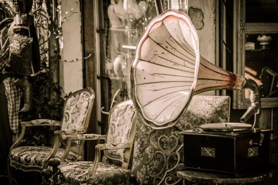 Wallpaper Big old gramophone in a room with chairs