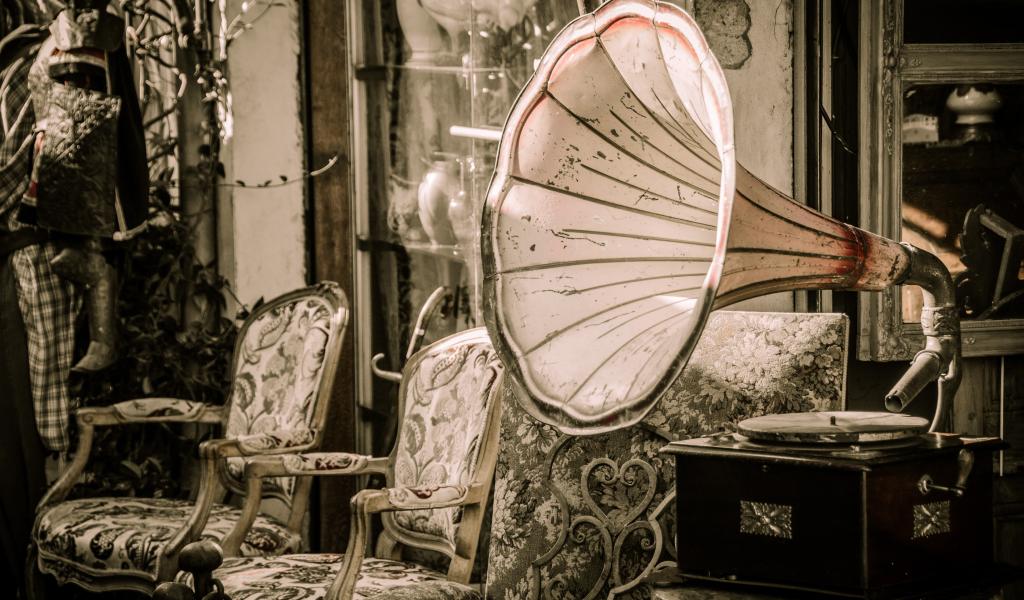 Wallpaper Big old gramophone in a room with chairs