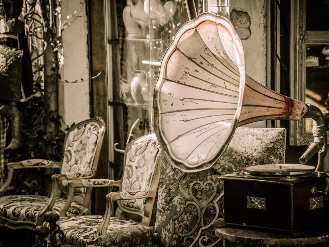Wallpaper Big old gramophone in a room with chairs