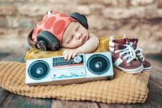 Wallpaper Sleeping baby in headphones and with a toy tape recorder