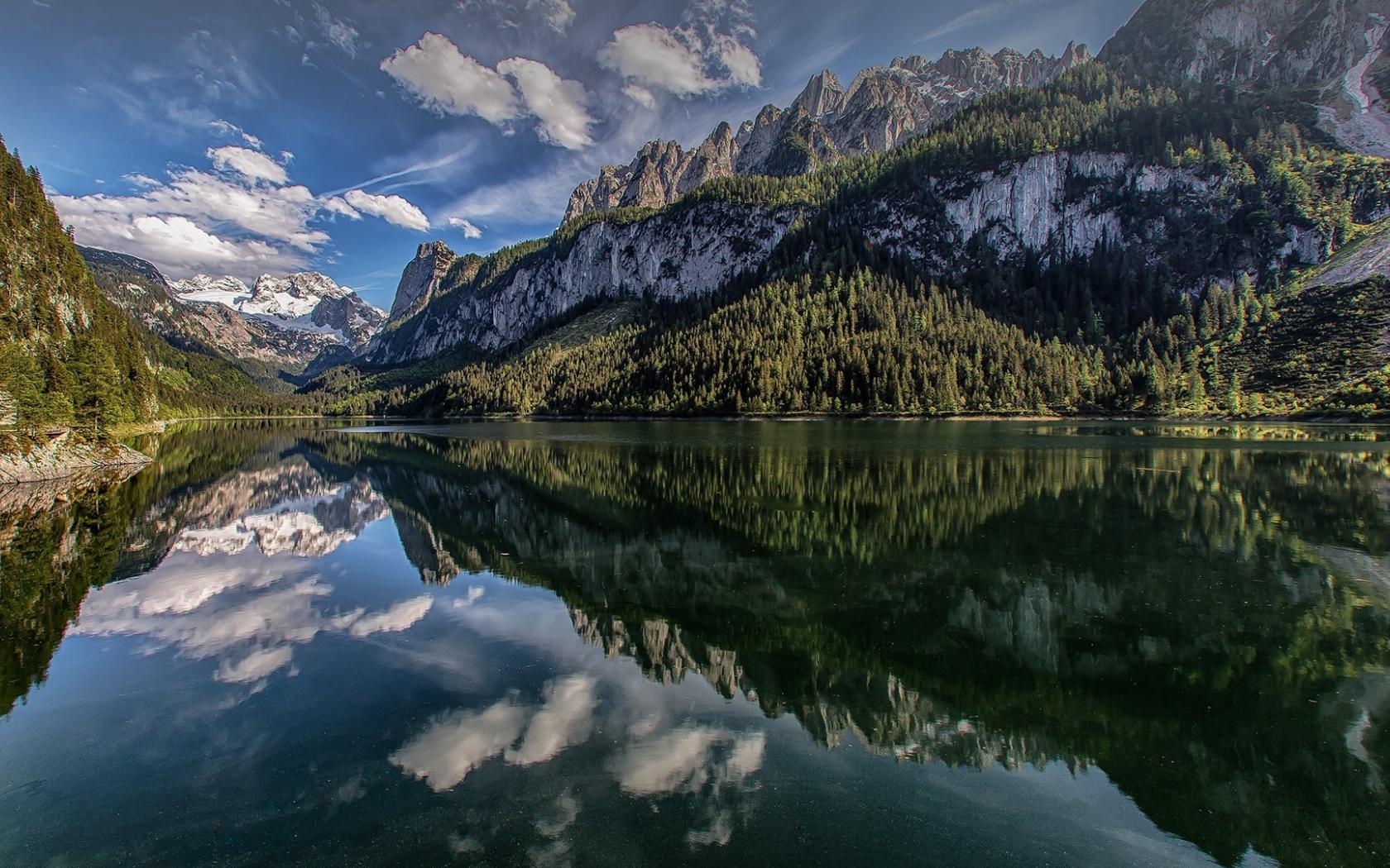 Wallpaper Pine trees and mountains reflected in the lake