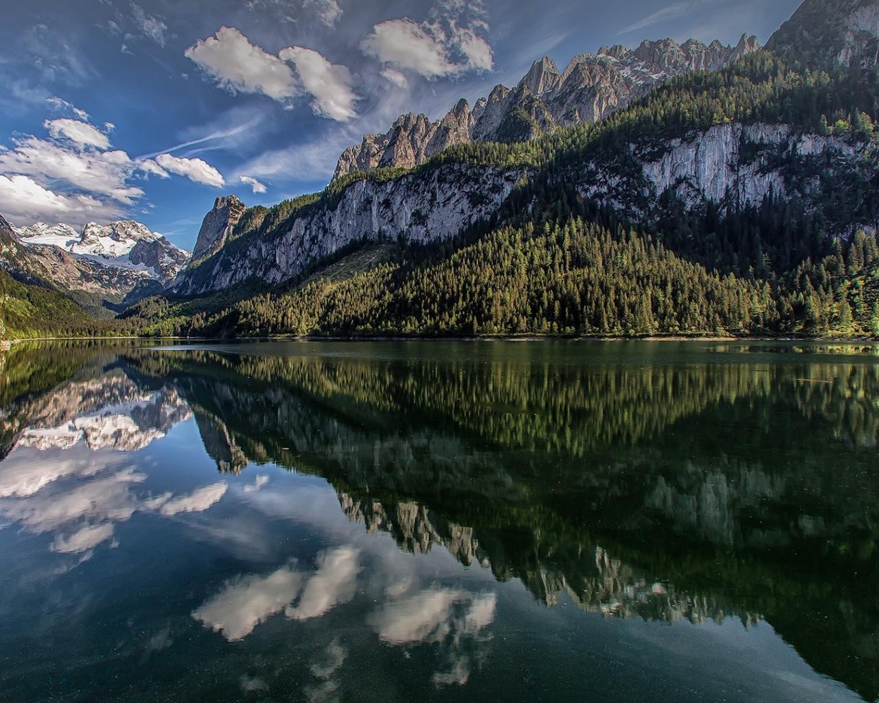 Wallpaper Pine trees and mountains reflected in the lake
