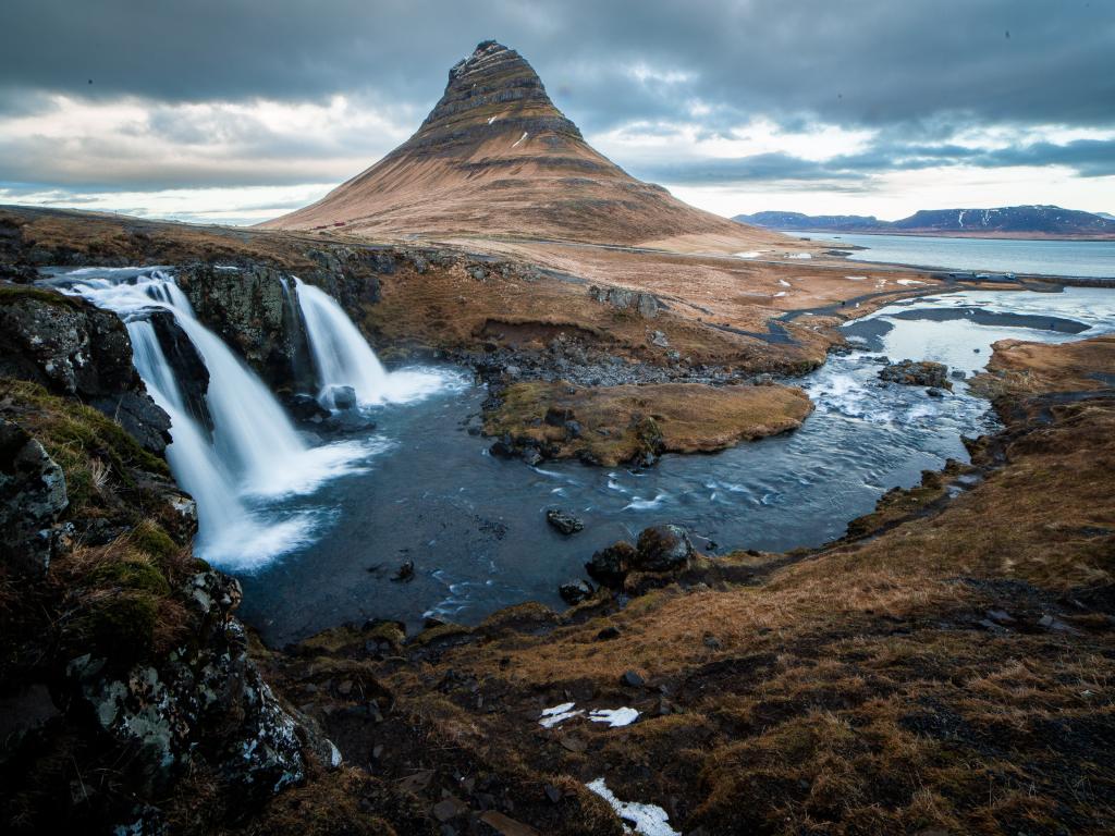 Wallpaper Mountain river and waterfall in Iceland