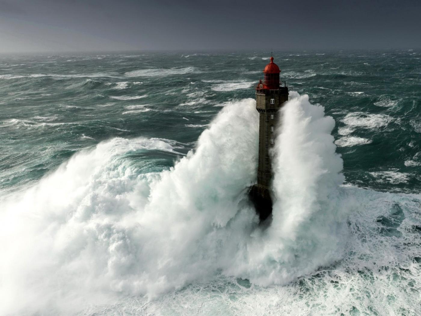 Wallpaper The surging wave envelops the lighthouse