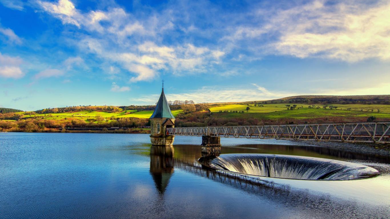 Wallpaper Iron bridge over the lake under the picturesque blue sky