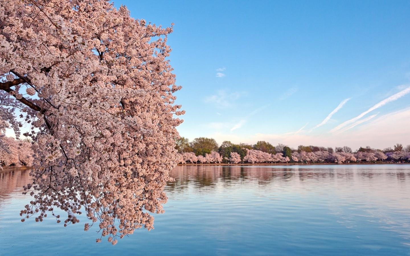 Wallpaper Flowering sakura trees above the water