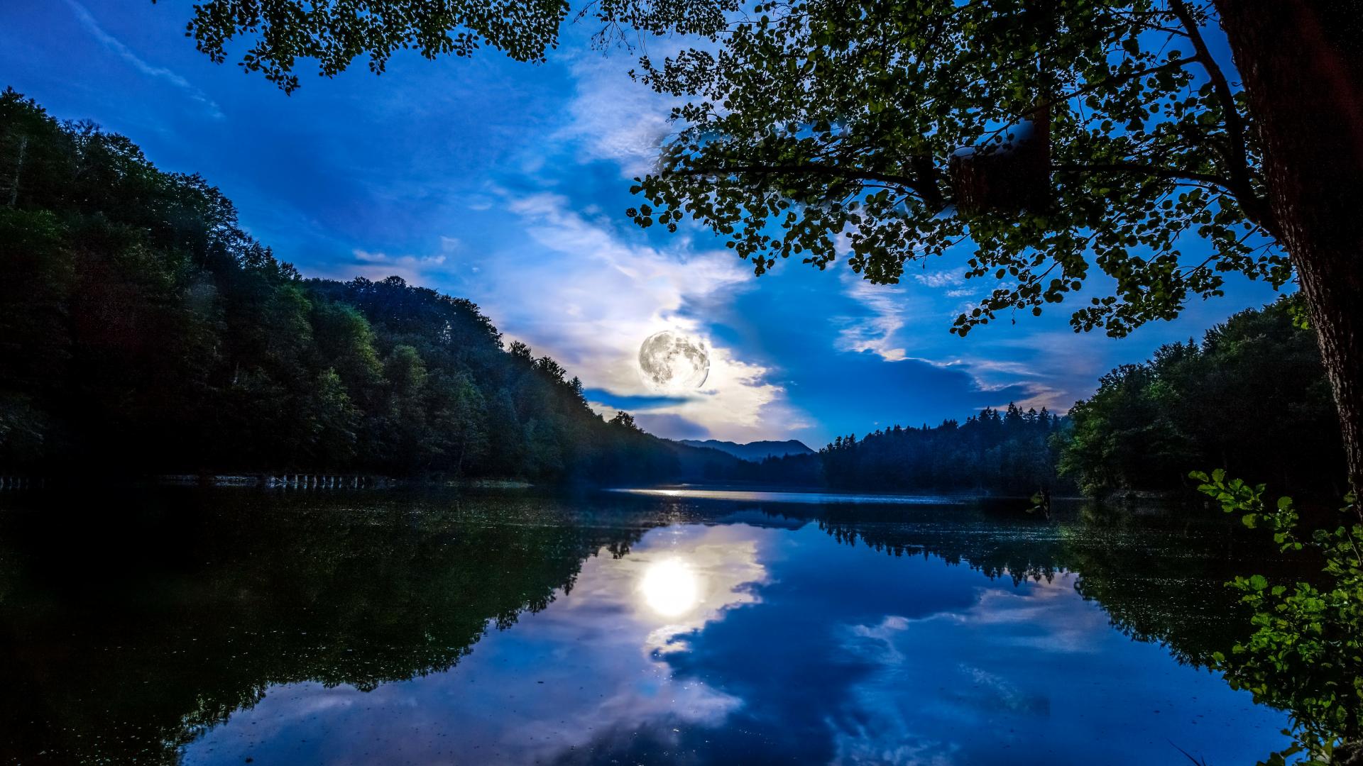 Wallpaper The big moon is reflected in the pond