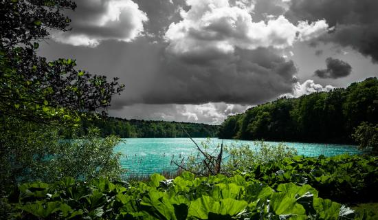 Wallpaper Blue water in the lake against the background of rain clouds