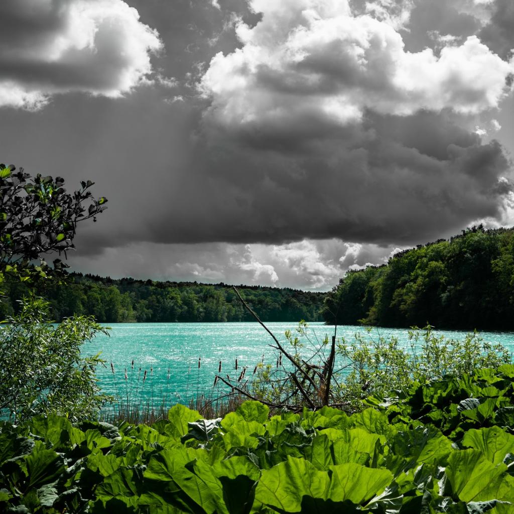 Wallpaper Blue water in the lake against the background of rain clouds