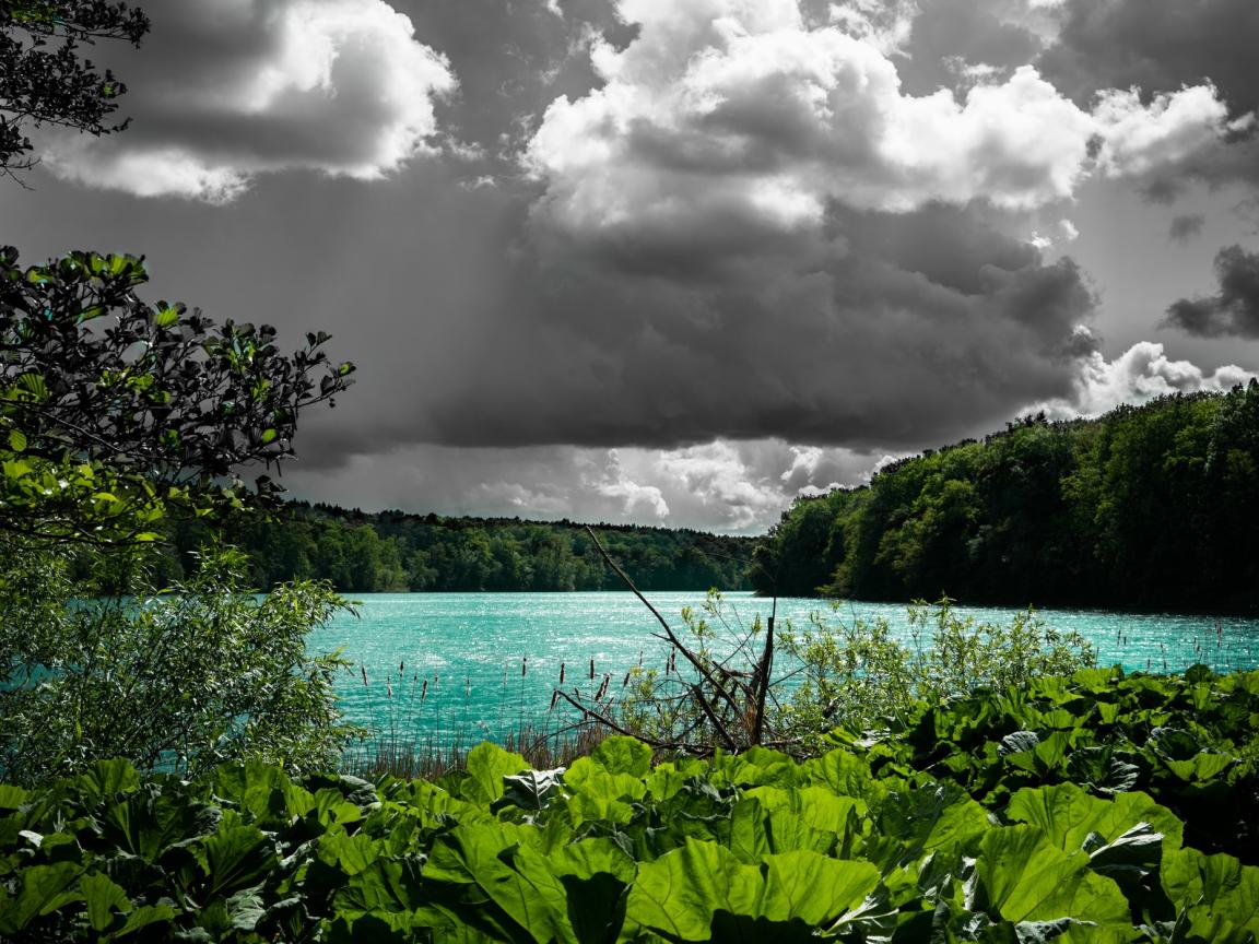 Wallpaper Blue water in the lake against the background of rain clouds