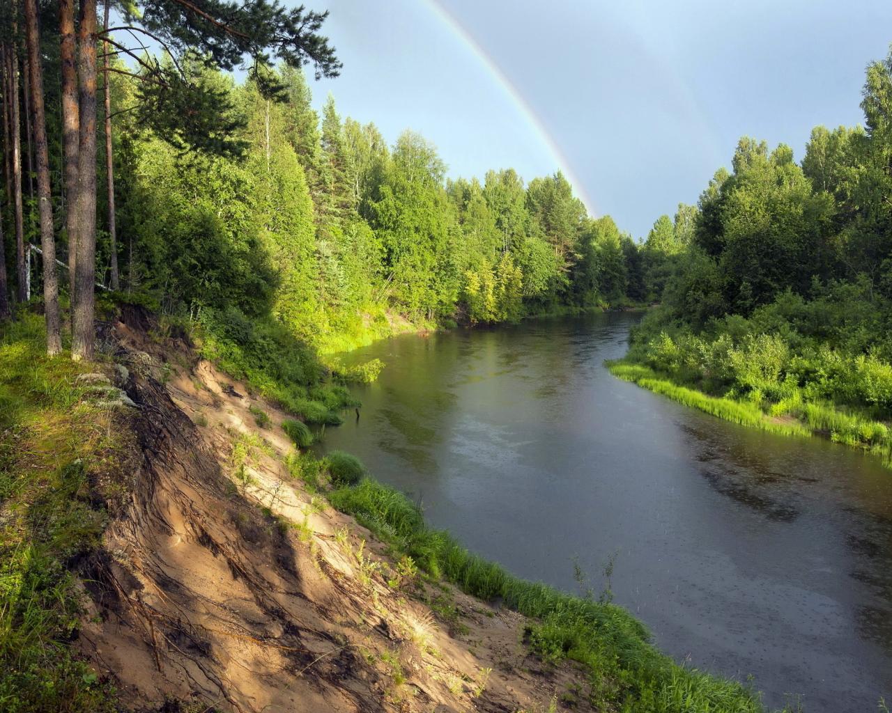 Wallpaper Rainbow over a river in a green forest