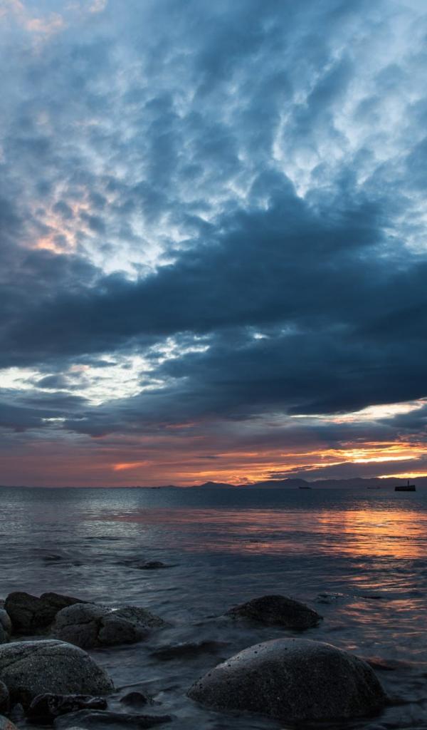 Wallpaper Boulders in the water on the beach against the cloudy sky background