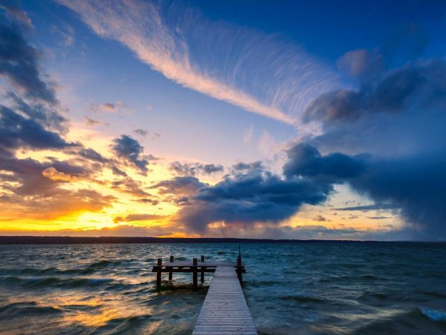 Wallpaper Bridge in the ocean at sunset
