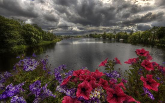 Wallpaper Cloudy clouds over the lake with flowers on the shore