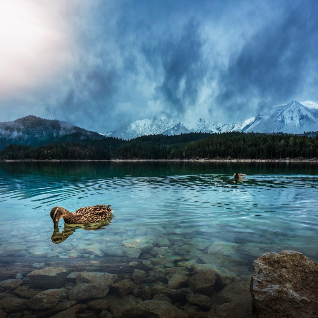 Wallpaper Ducks swim in the clear water of a mountain lake