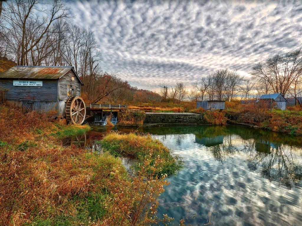 Wallpaper The sky is reflected in the pond near the water tower