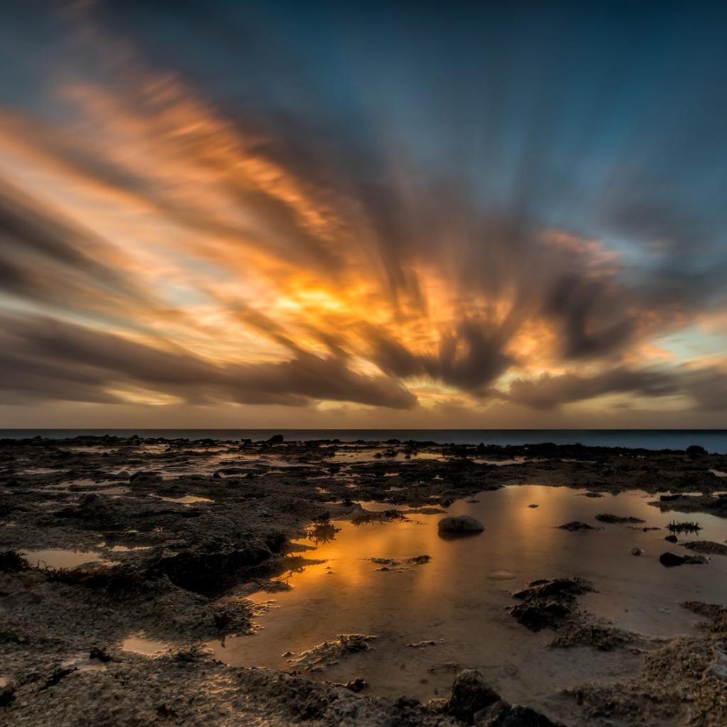 Wallpaper Sunset in the clouds above the water