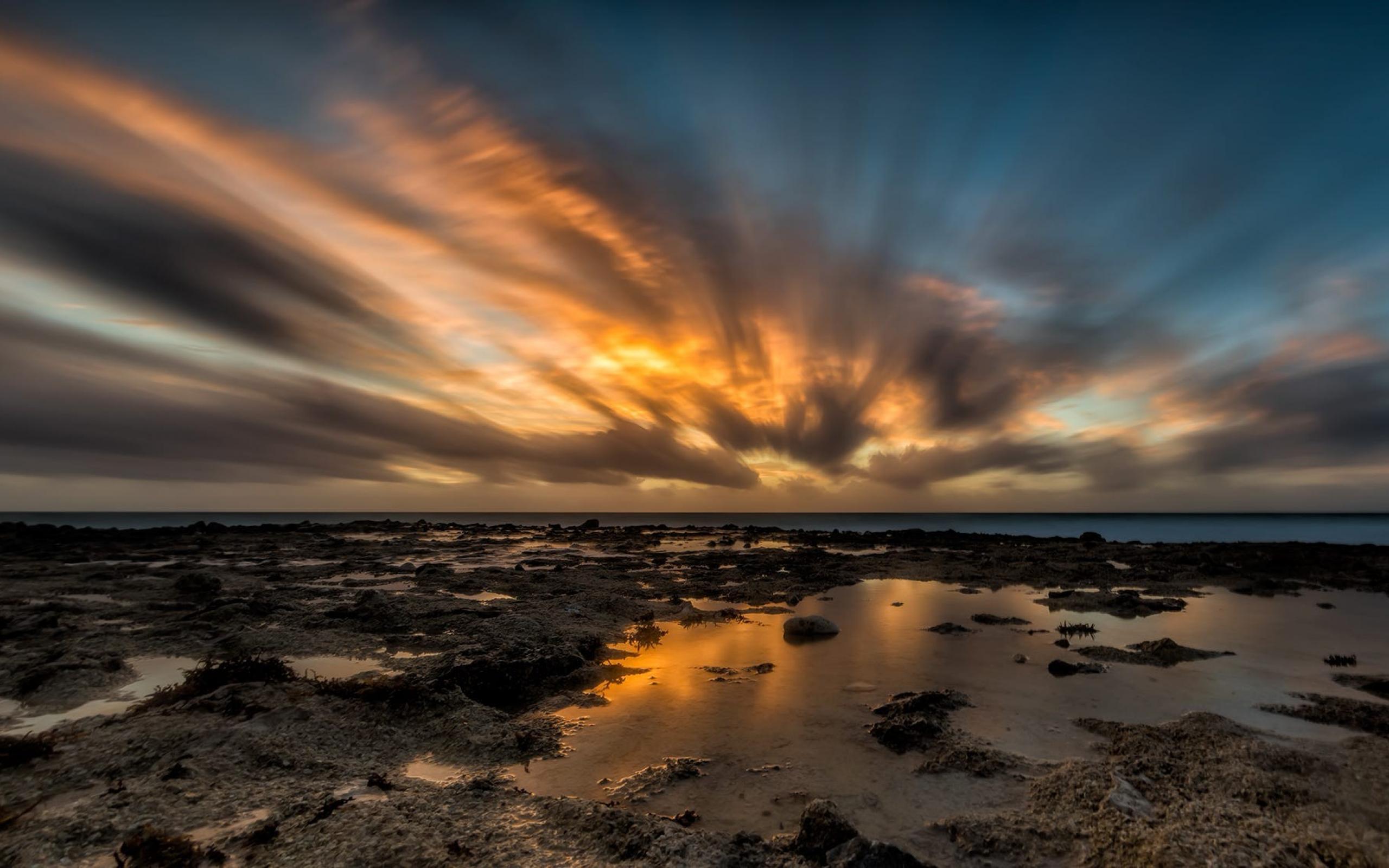 Wallpaper Sunset in the clouds above the water