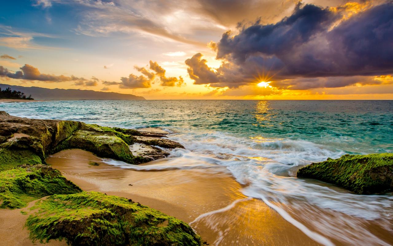 Wallpaper Sunset bright sun in the clouds above the ocean