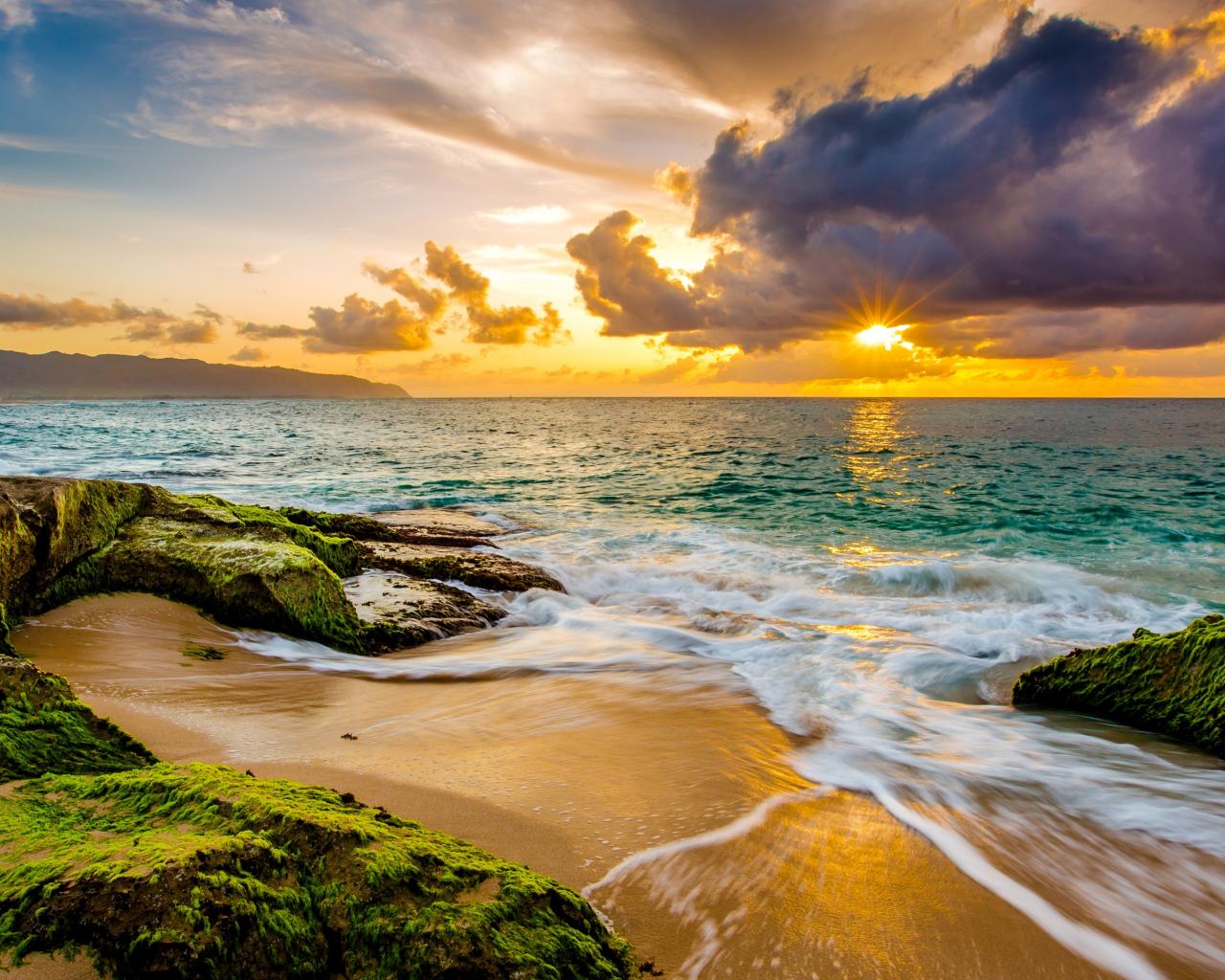 Wallpaper Sunset bright sun in the clouds above the ocean