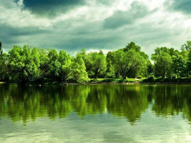 Wallpaper Green trees are reflected in the lake`s surface