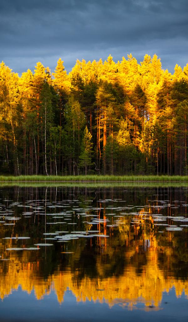 Wallpaper Coniferous forest is reflected in the clear water of the lake