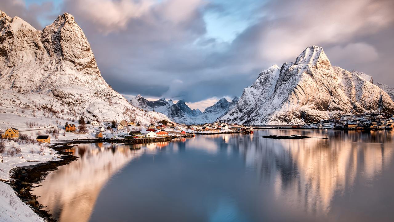 Wallpaper Lake near the snow-capped mountains, Lofoten Islands. Norway