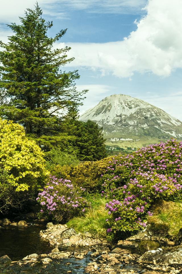 Wallpaper Красивая цветущая природа и ручей на фоне горы