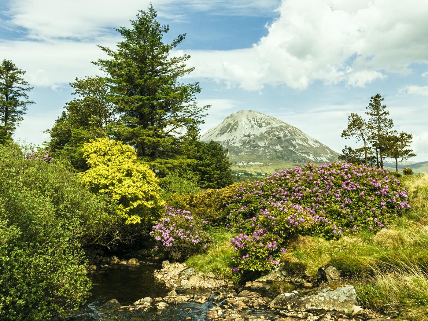 Wallpaper Красивая цветущая природа и ручей на фоне горы
