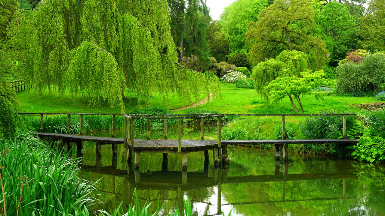 Wallpaper Green trees over the old bridge near the pond in the park