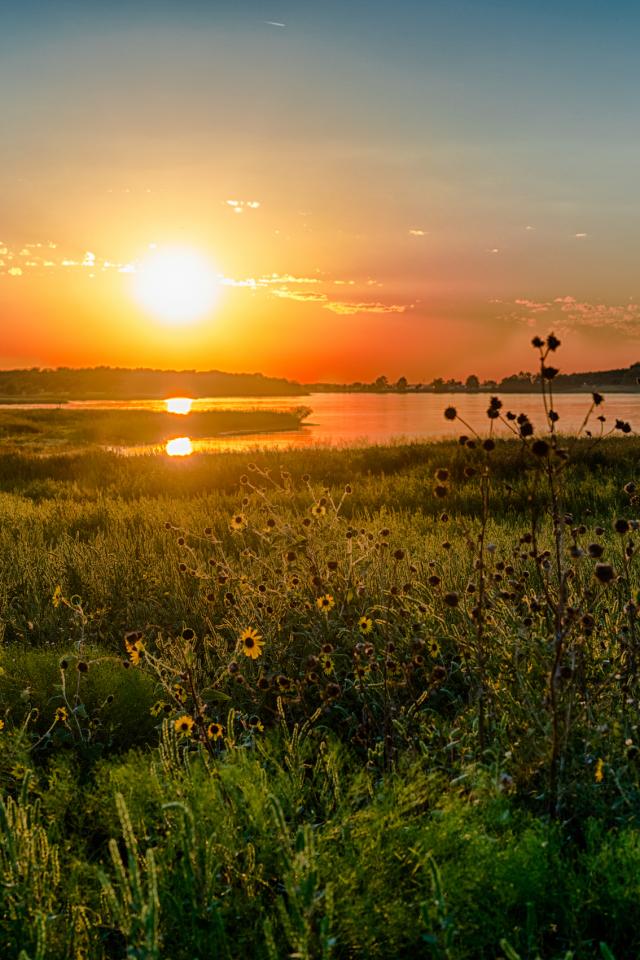Wallpaper Wildflowers at sunset over the lake