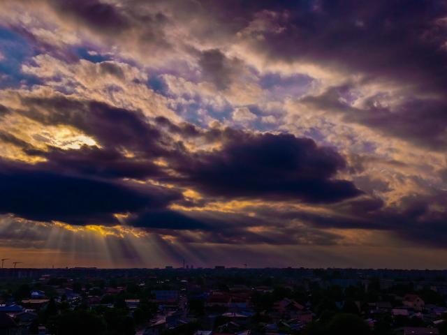 Wallpaper The rays of the sun make their way through the clouds over the city