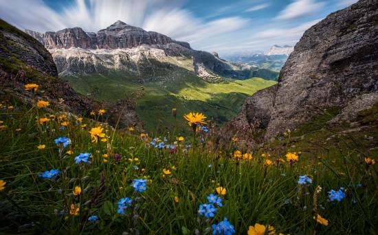 Wallpaper Wildflowers on a background of mountains under a beautiful blue sky
