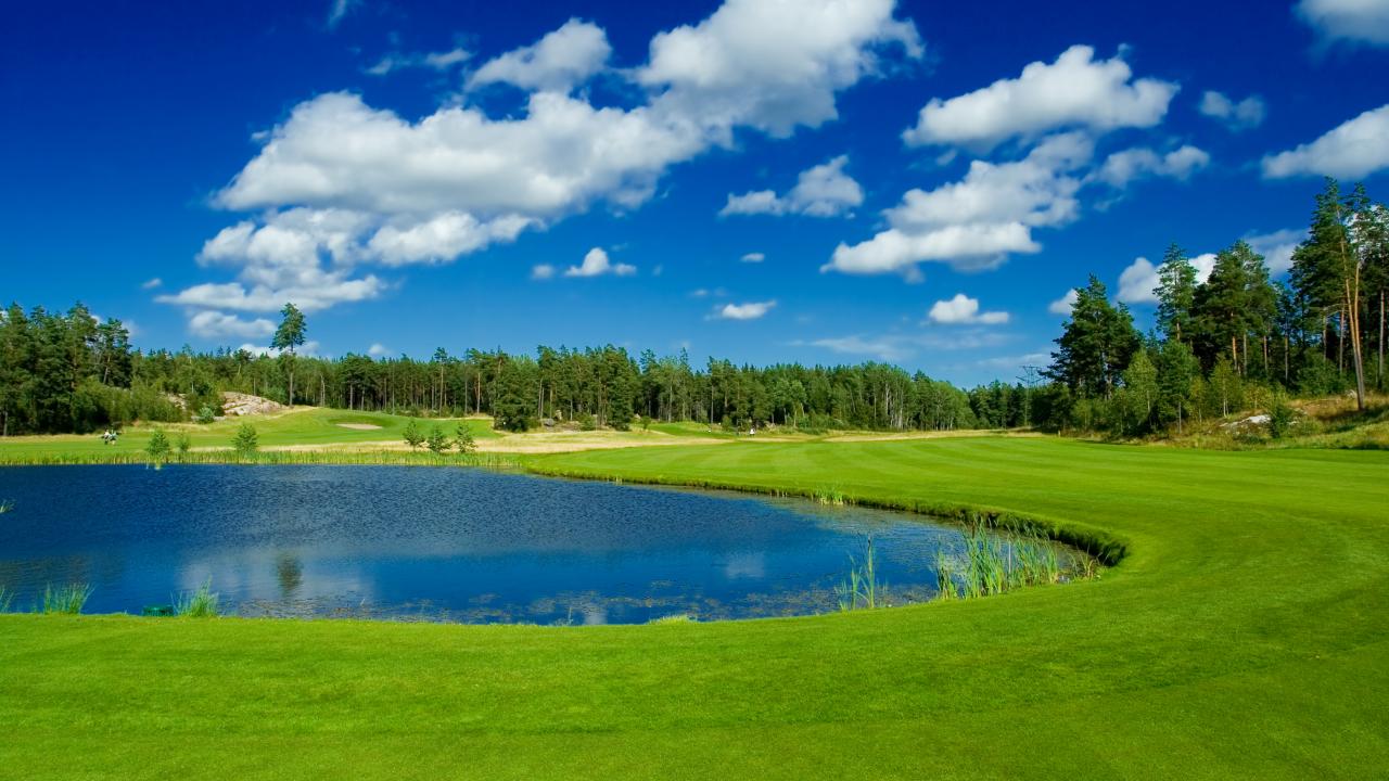Wallpaper Pond in the park near the green lawn against the blue sky