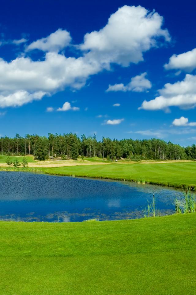 Wallpaper Pond in the park near the green lawn against the blue sky