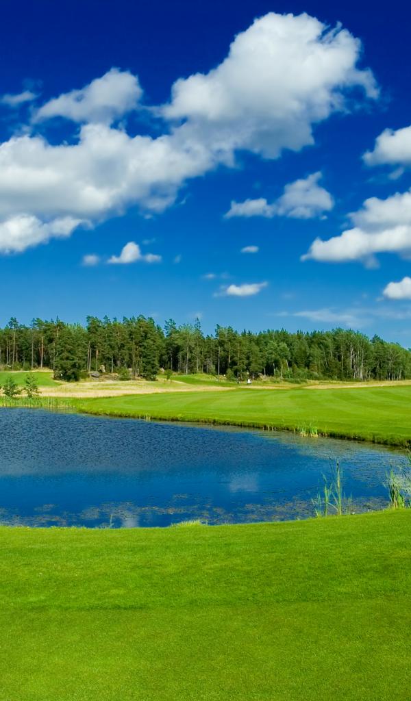 Wallpaper Pond in the park near the green lawn against the blue sky