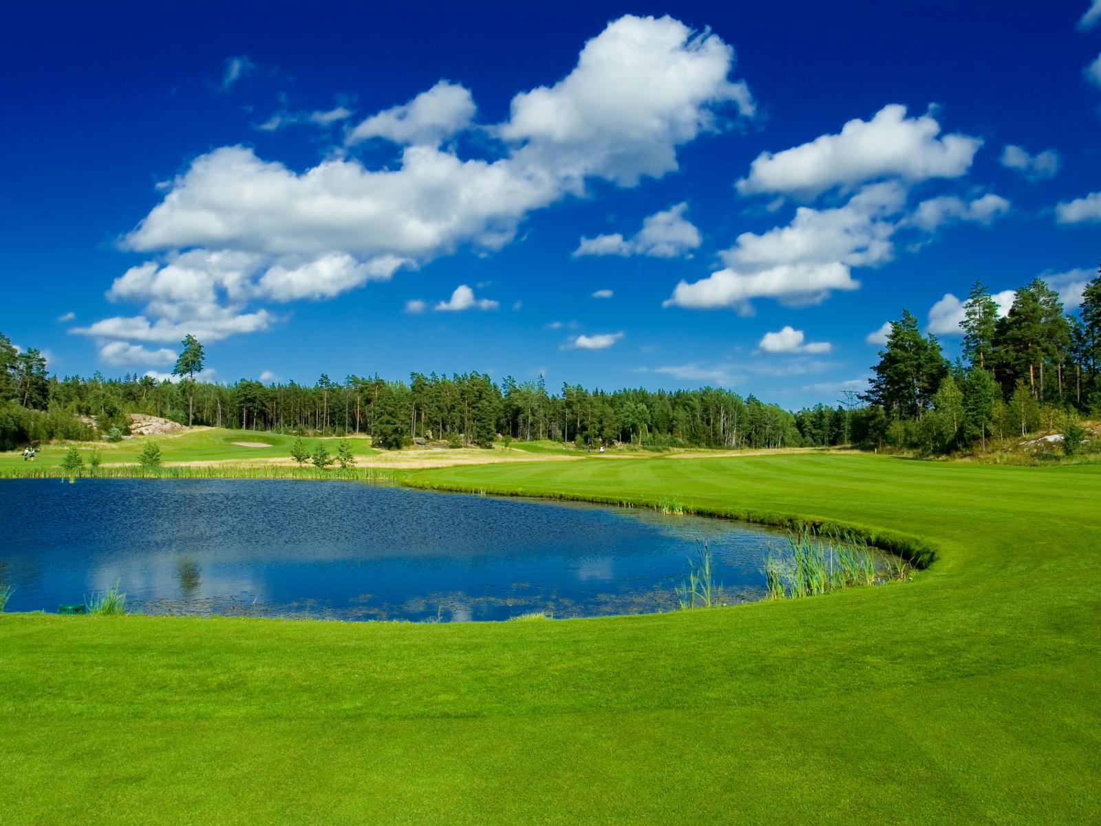 Wallpaper Pond in the park near the green lawn against the blue sky