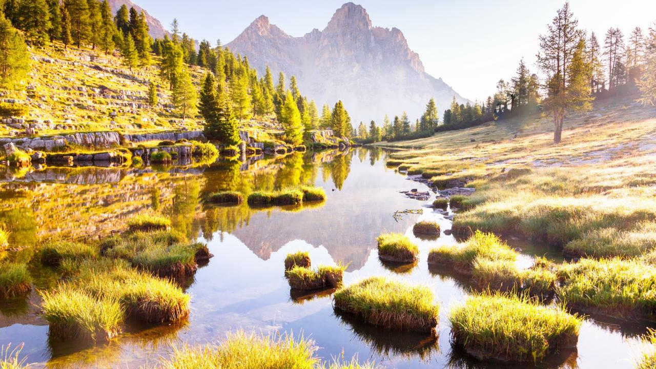 Wallpaper Mountains grass and trees are reflected in the forest lake