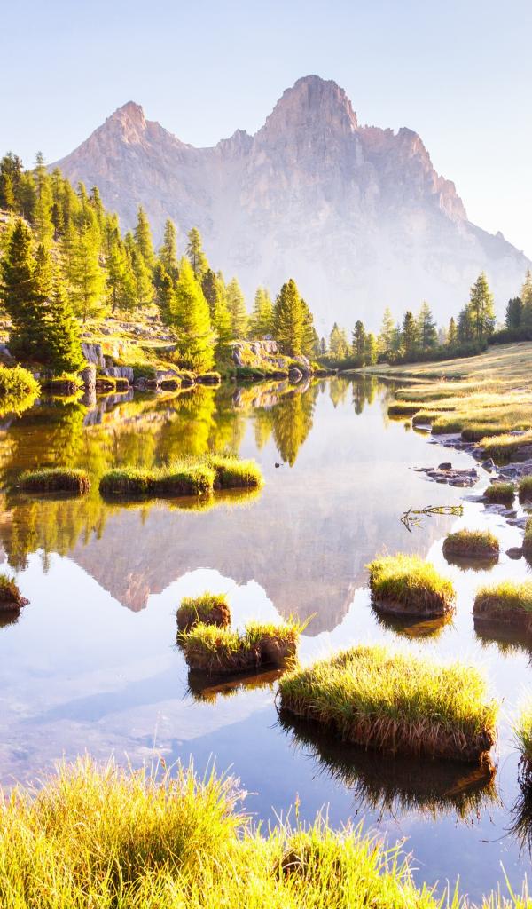Wallpaper Mountains grass and trees are reflected in the forest lake
