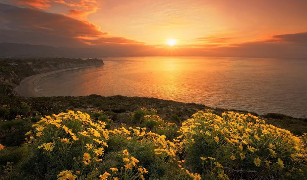 Wallpaper Yellow flowers on the ocean at sunset