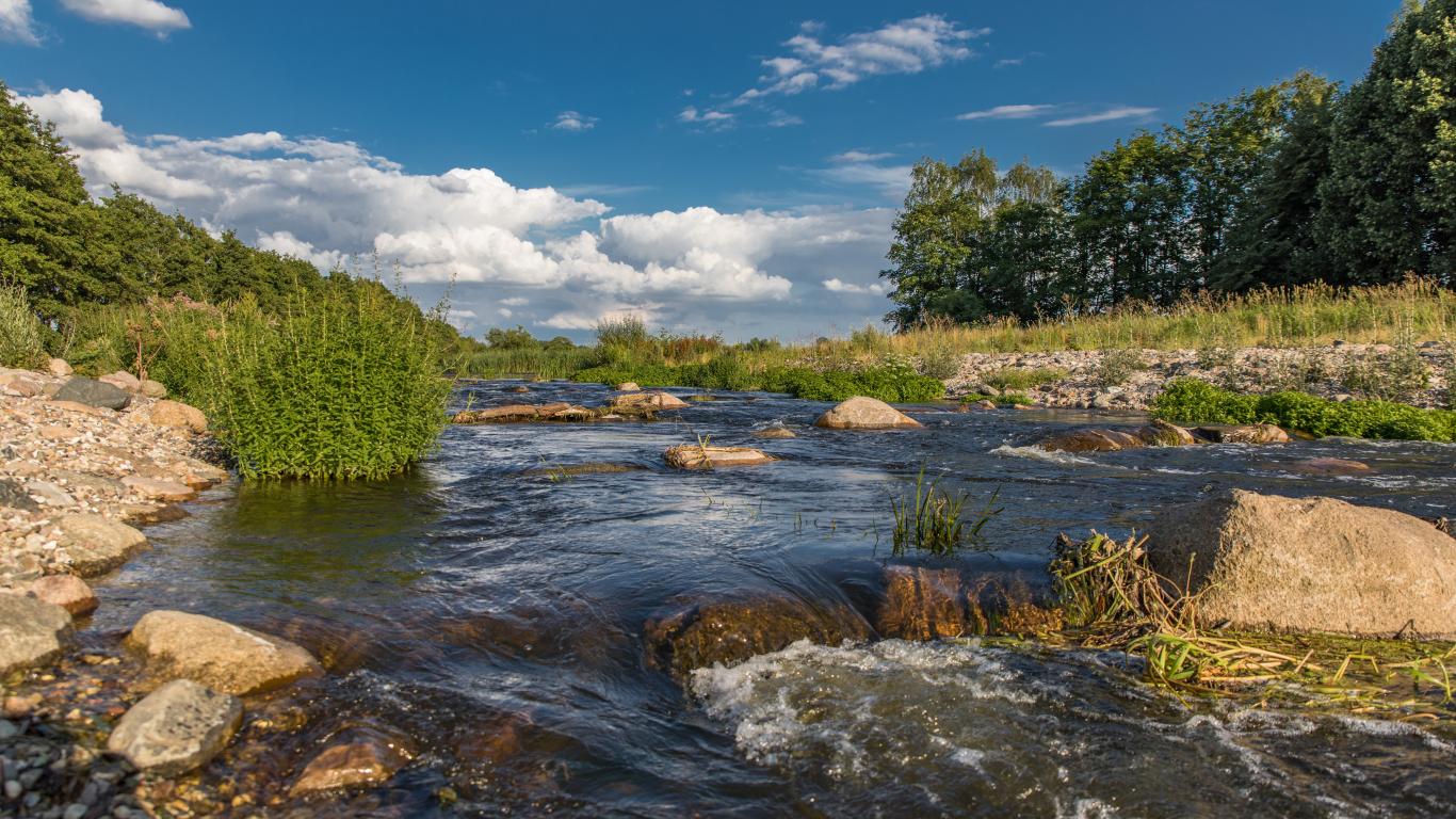 Wallpaper Fast river water flows down the rocks under the beautiful blue sky
