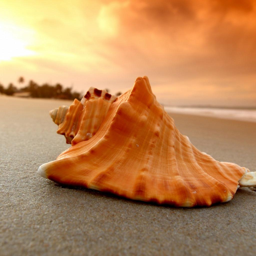 Wallpaper Large shell lies on hot sand at sunset