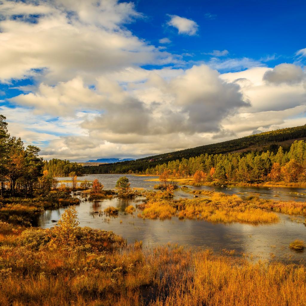 Wallpaper Forest lake with yellow autumn trees against the sky with white clouds