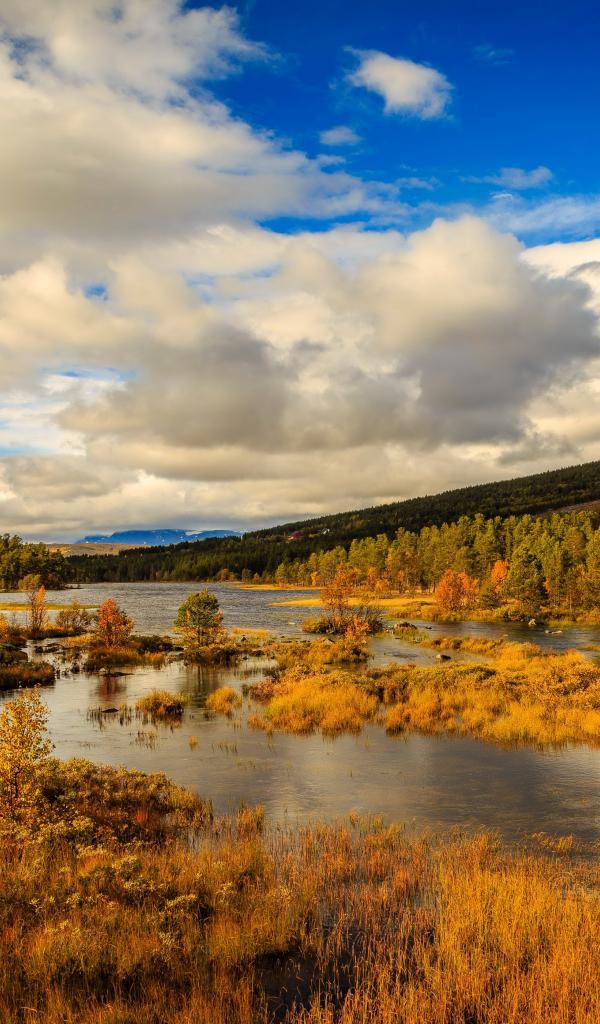 Wallpaper Forest lake with yellow autumn trees against the sky with white clouds