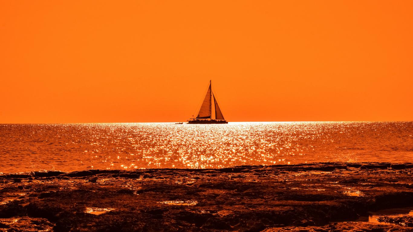 Wallpaper Sailing boat on the horizon in the ocean at sunset