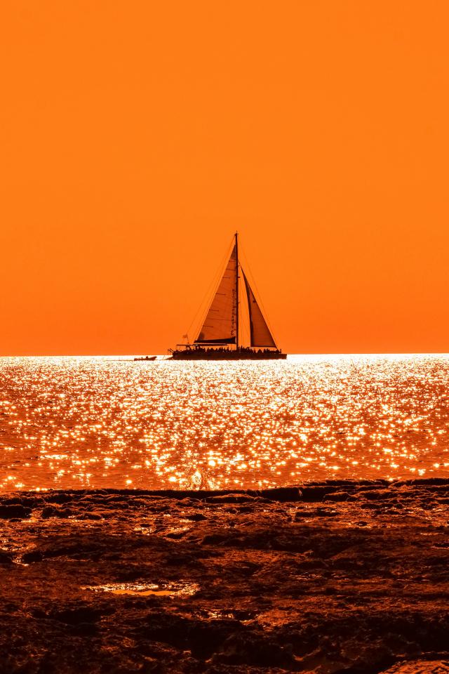 Wallpaper Sailing boat on the horizon in the ocean at sunset