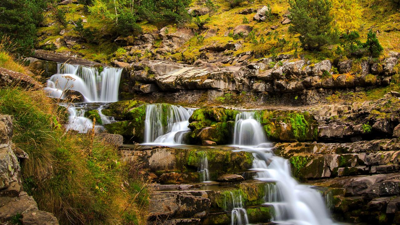 Wallpaper A fast stream flows down the cliff in the autumn forest