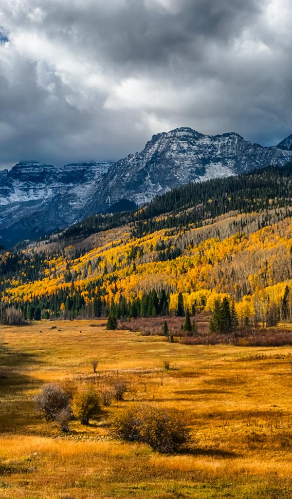 Wallpaper Autumn forest under big white clouds in the mountains