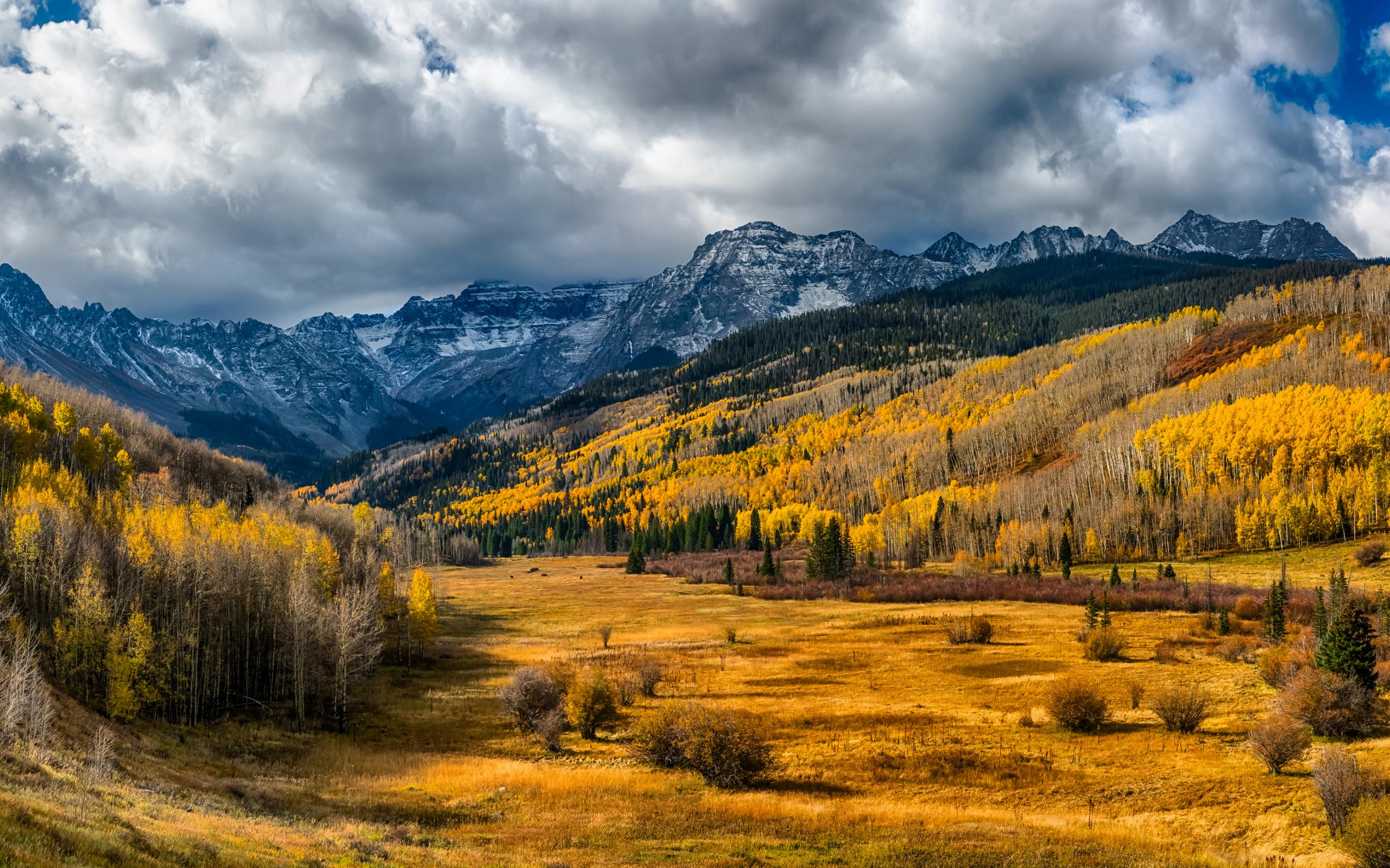 Wallpaper Autumn forest under big white clouds in the mountains